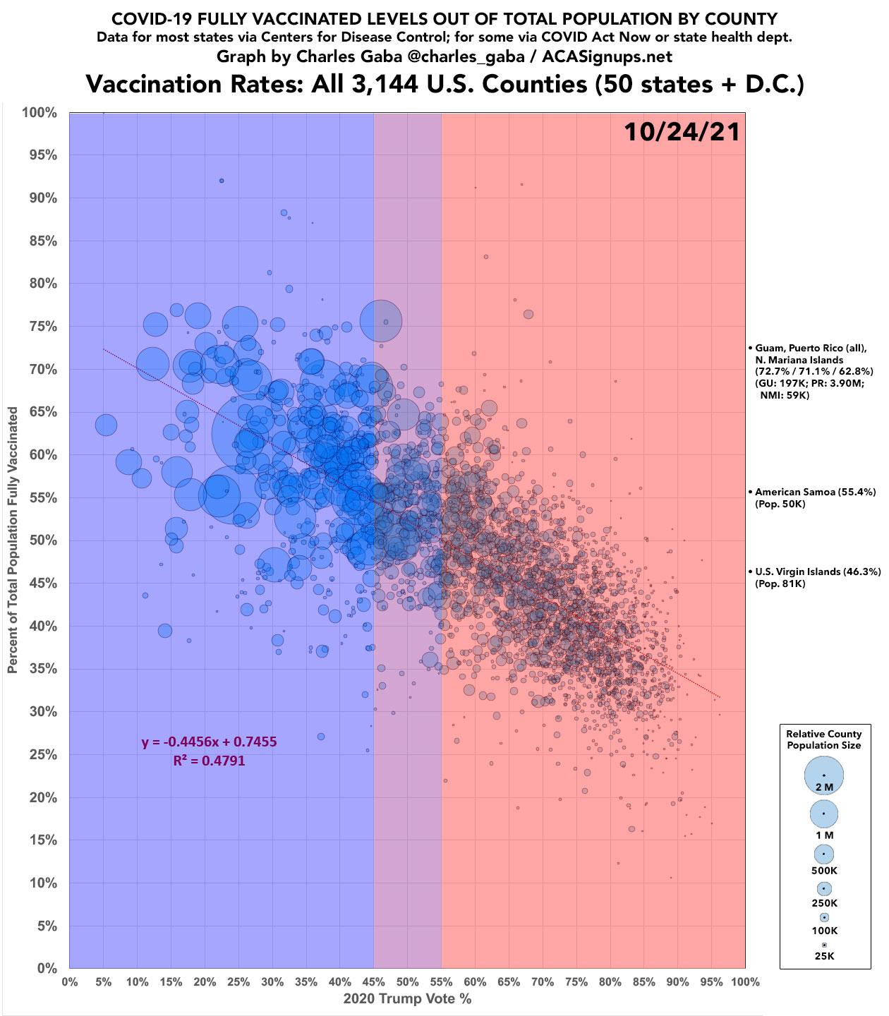 Politics is once again leading to more deaths. I’ve been tracking vaccination rates by county, and the factors influencing vaccination since my report in May. Last month, the difference in vaccination growth rate between the counties where Trump won by a margin of 2:1 or more and counties where Biden won by a margin of 2:1 or more was 82%. 82% difference! In addition to my October’s report, here is another researcher’s chart and analysis of the significant political divide.