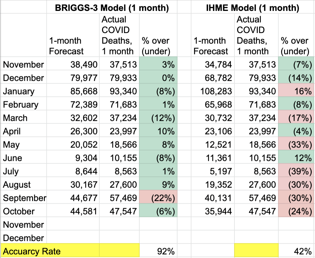 Overall, the Briggs-3 model has been among the most accurate. For the one month forecast, we define it as accurate if it is within +/-15%. Briggs-3 has been accurate in 11 of the last 12 months (92% accuracy) for projecting COVID-19 deaths one month into the future. This compares favorably to well known forecasts like IHME’s, which was accurate 42% of the time, when counting incremental deaths for the month. For October, the model predicted 44,581 reported deaths in the US. The actual was 47,547, which means the Briggs-3 forecast was about 6% lower than the actual. IHME forecasted 35,944, which is 24% lower than the actual.