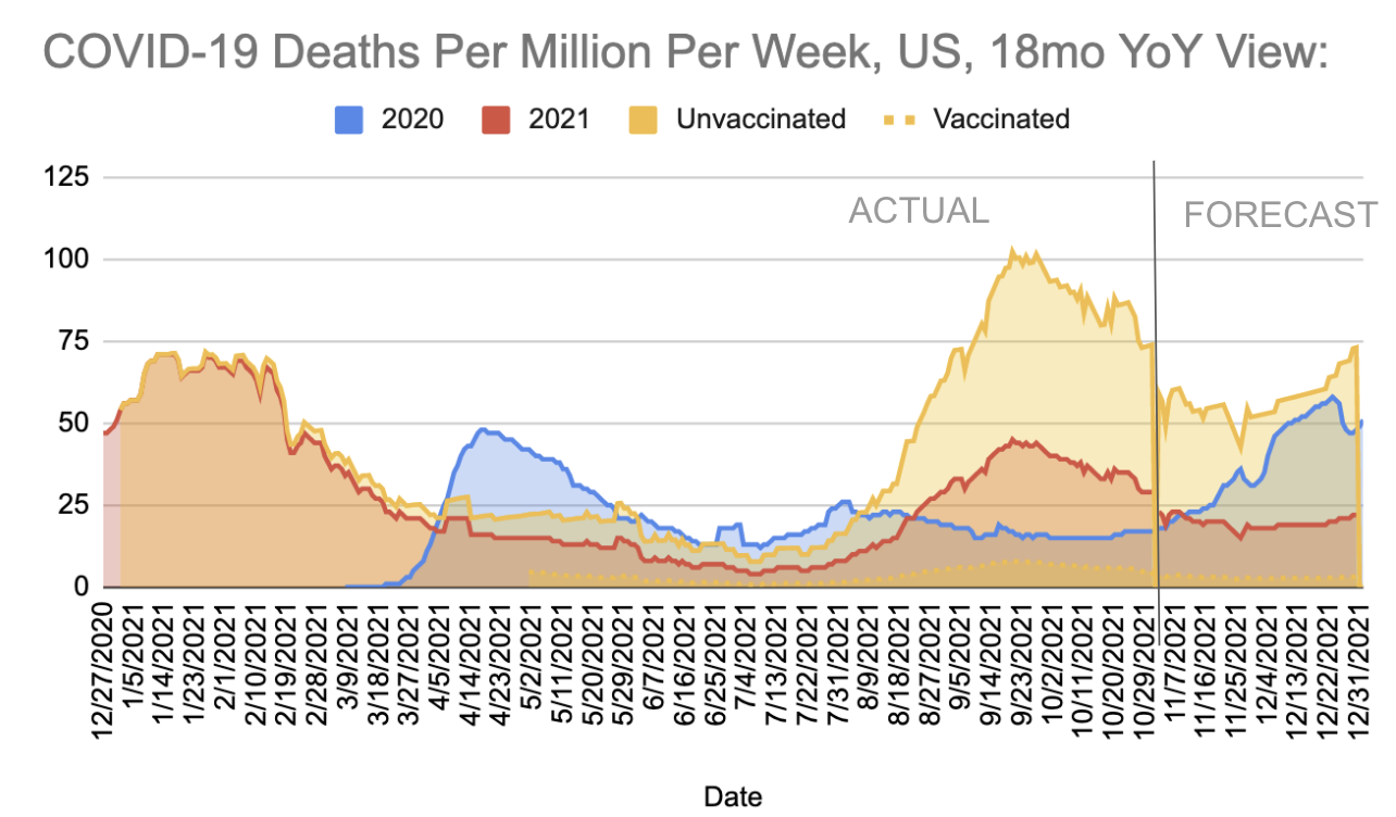 A forecast for 2022 should start with a 2020 Presidential Election map. COVID-19 deaths per capita are still the most important factor influencing vaccinations, but many in conservative counties dismiss COVID-19 deaths as over-reported and caused by underlying conditions, or complete fabrication. However, that is not an accurate interpretation. Instead, COVID-19 deaths are underreported as I demonstrated in last month’s analysis -- and likely more under-reported in conservative counties based on my preliminary investigations. As a result of the behaviors of the unvaccinated, I have raised the forecast for November to an incremental 28,105 deaths, and December to 28,595. The total reported deaths at the end of 2021 are now forecast to exceed 800,000.